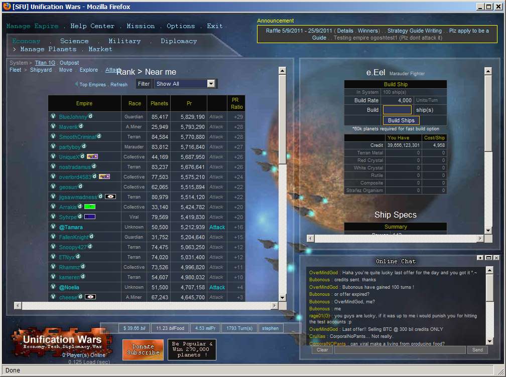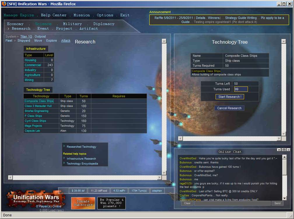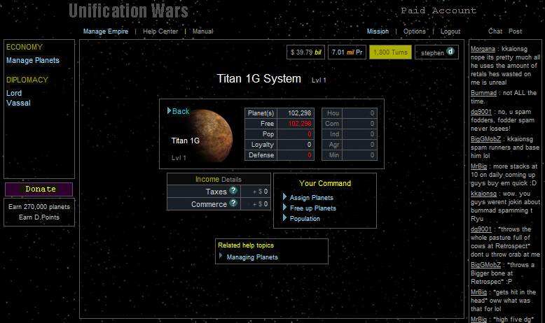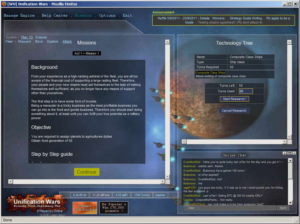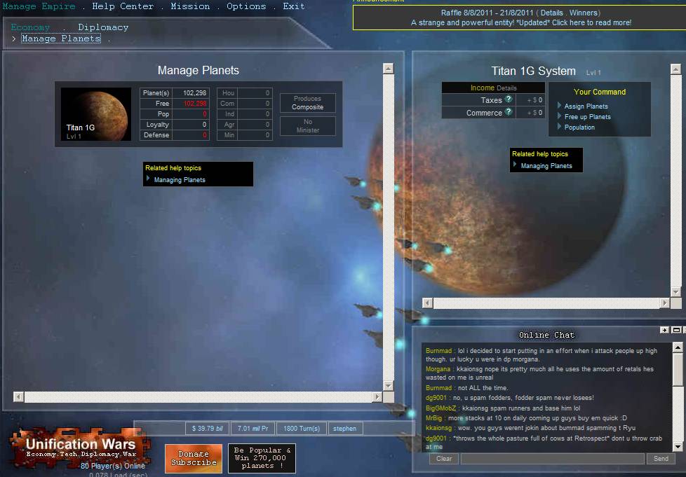 Unification Wars is a space theme strategy game, that allows players to explore and colonize planets, research technology, build ships, and to wage war. This includes improve their own economy balancing diplomatic relationships with other players, and joining or participating in Federations (space-guilds) or Federation Wars.