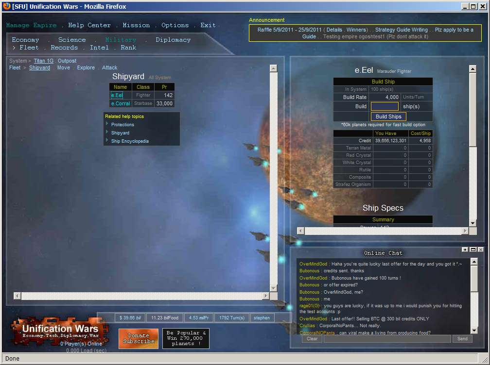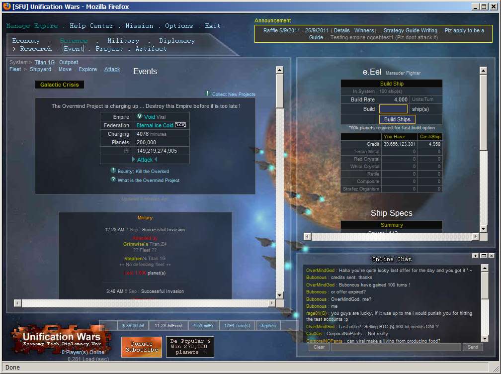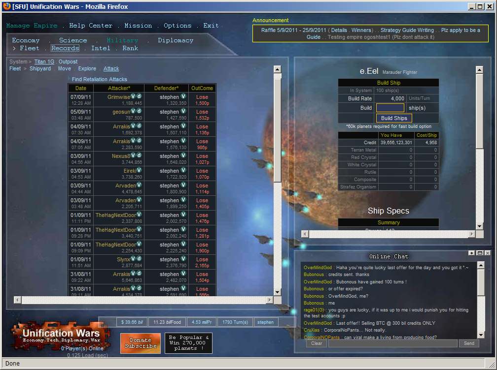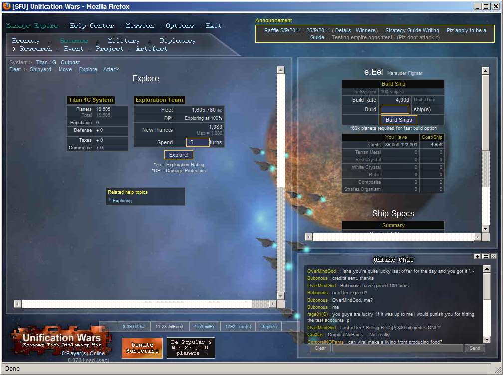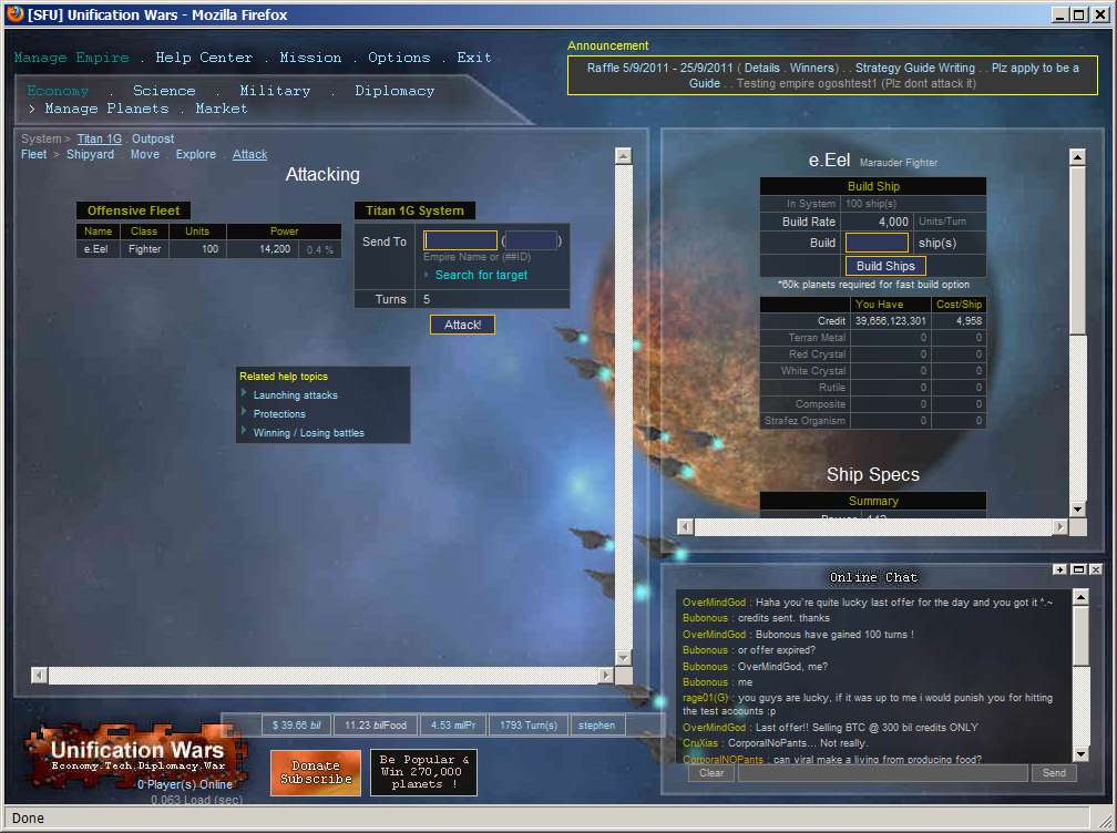 Unification Wars is a space theme strategy game, that allows players to explore and colonize planets, research technology, build ships, and to wage war. This includes improve their own economy balancing diplomatic relationships with other players, and joining or participating in Federations (space-guilds) or Federation Wars.